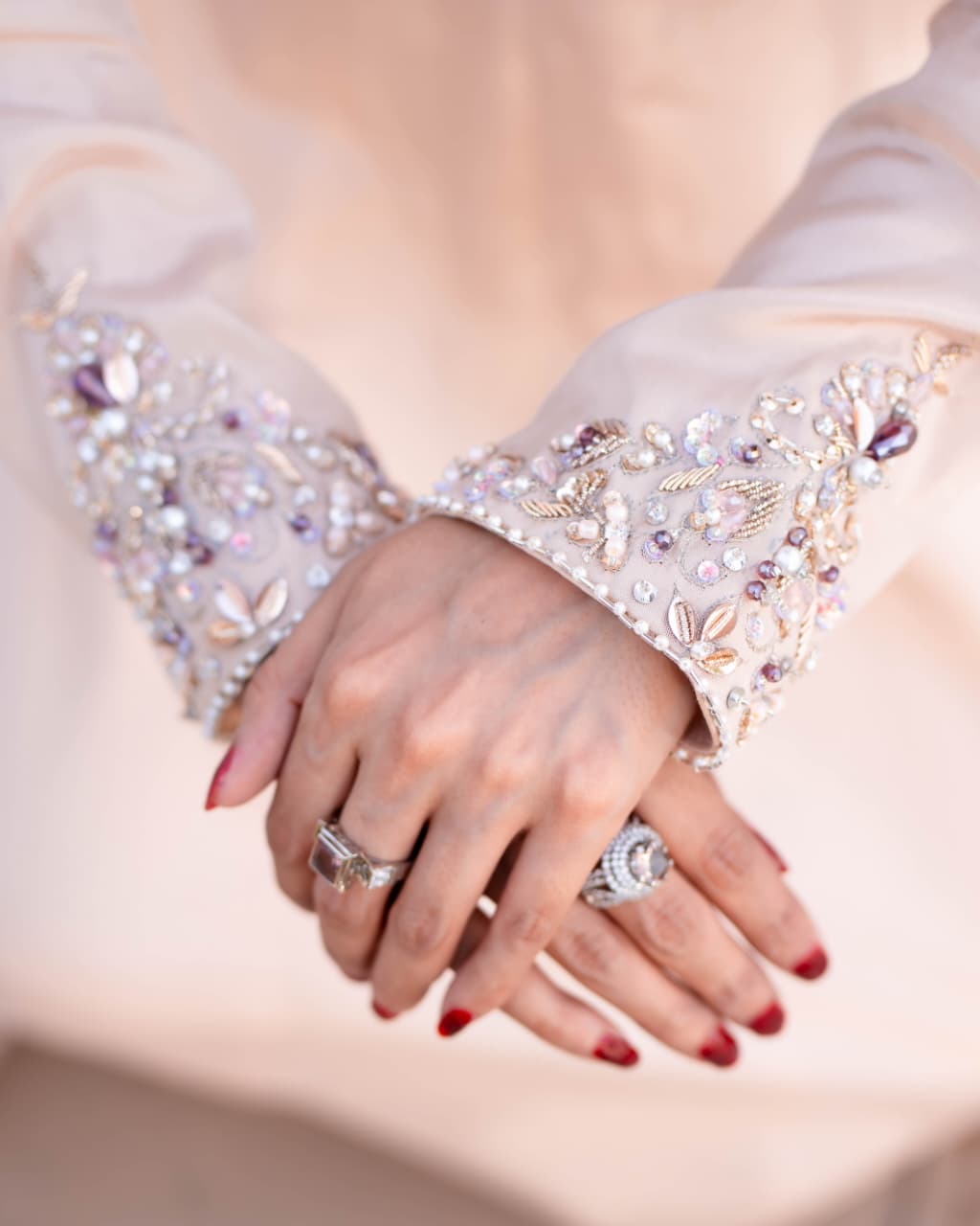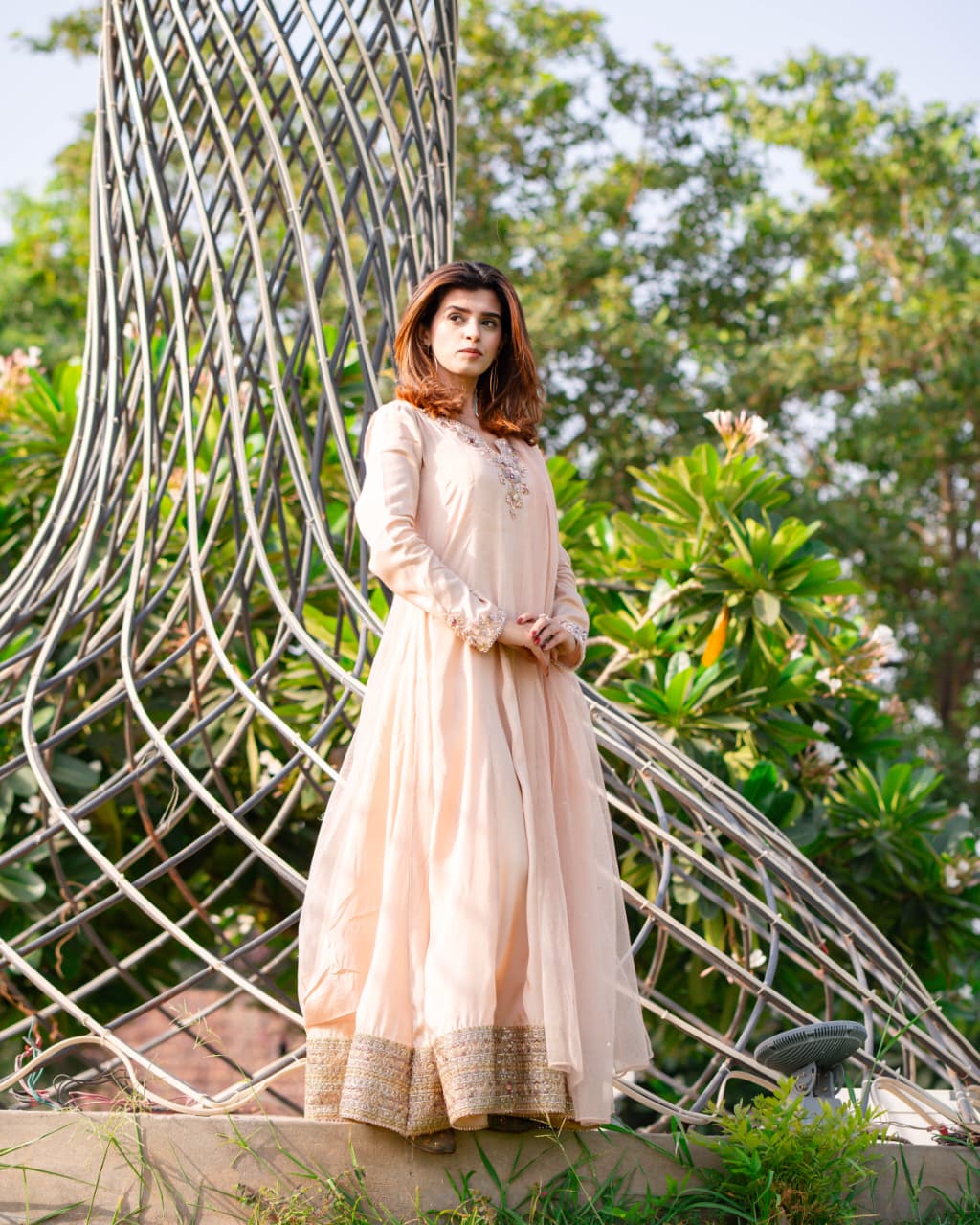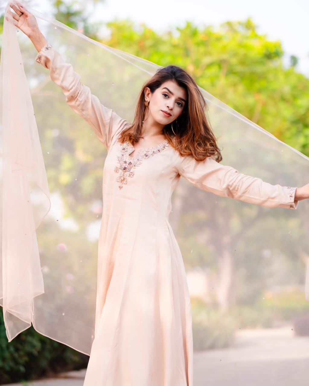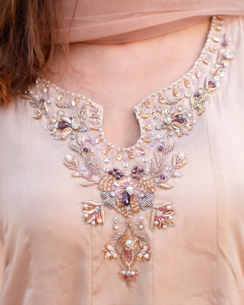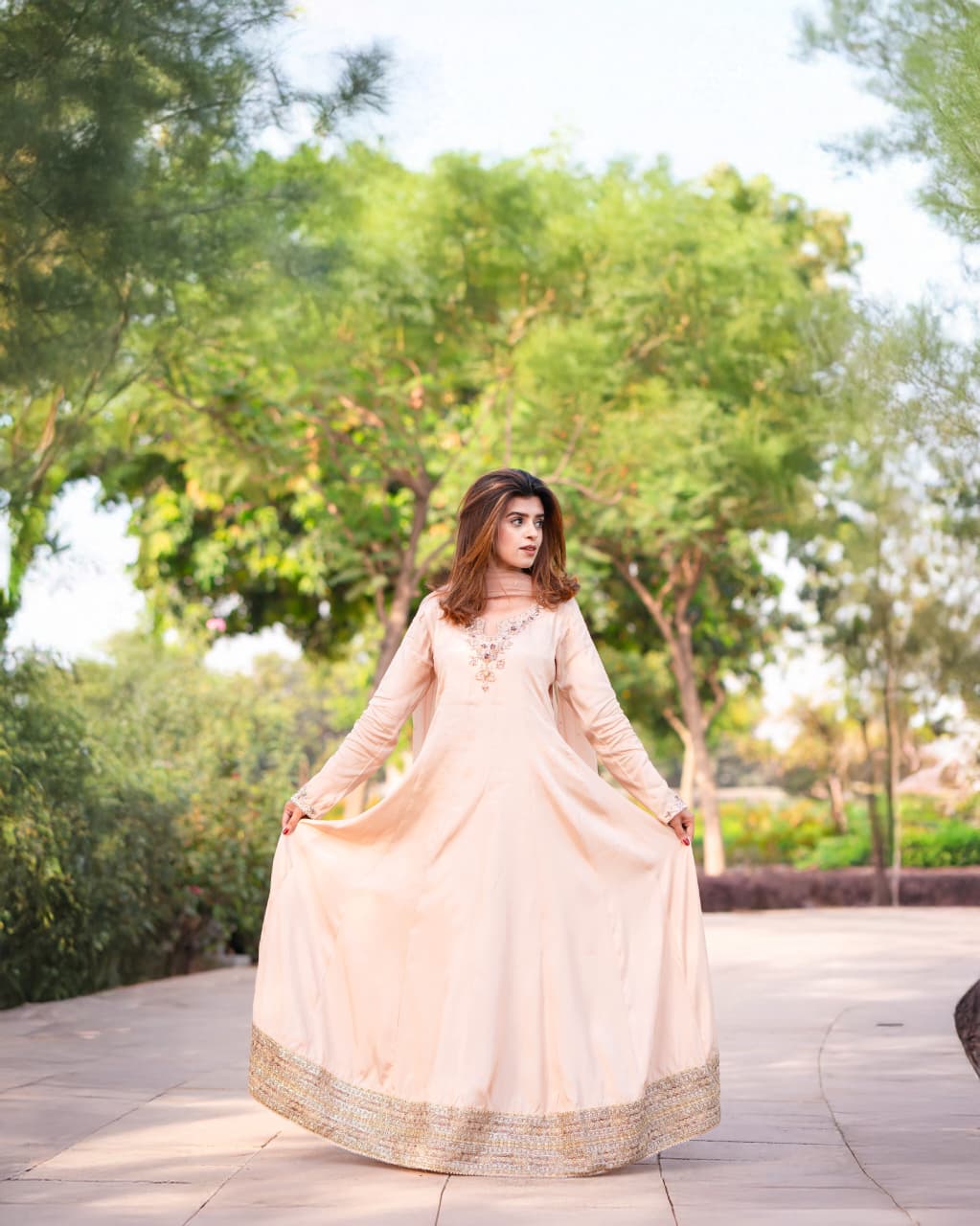 “This exquisite maxi dress is crafted from luxurious silk and features intricate embroidery adorned with crystals, cutdana, and sequence work. The bottom of the dress boasts a stunning sequence border, while the sleeves showcase impressive embroidery. The accompanying dupatta is made of net fabric with a beautiful crystal spray, adding a touch of elegance to the overallĀ ensemble.”