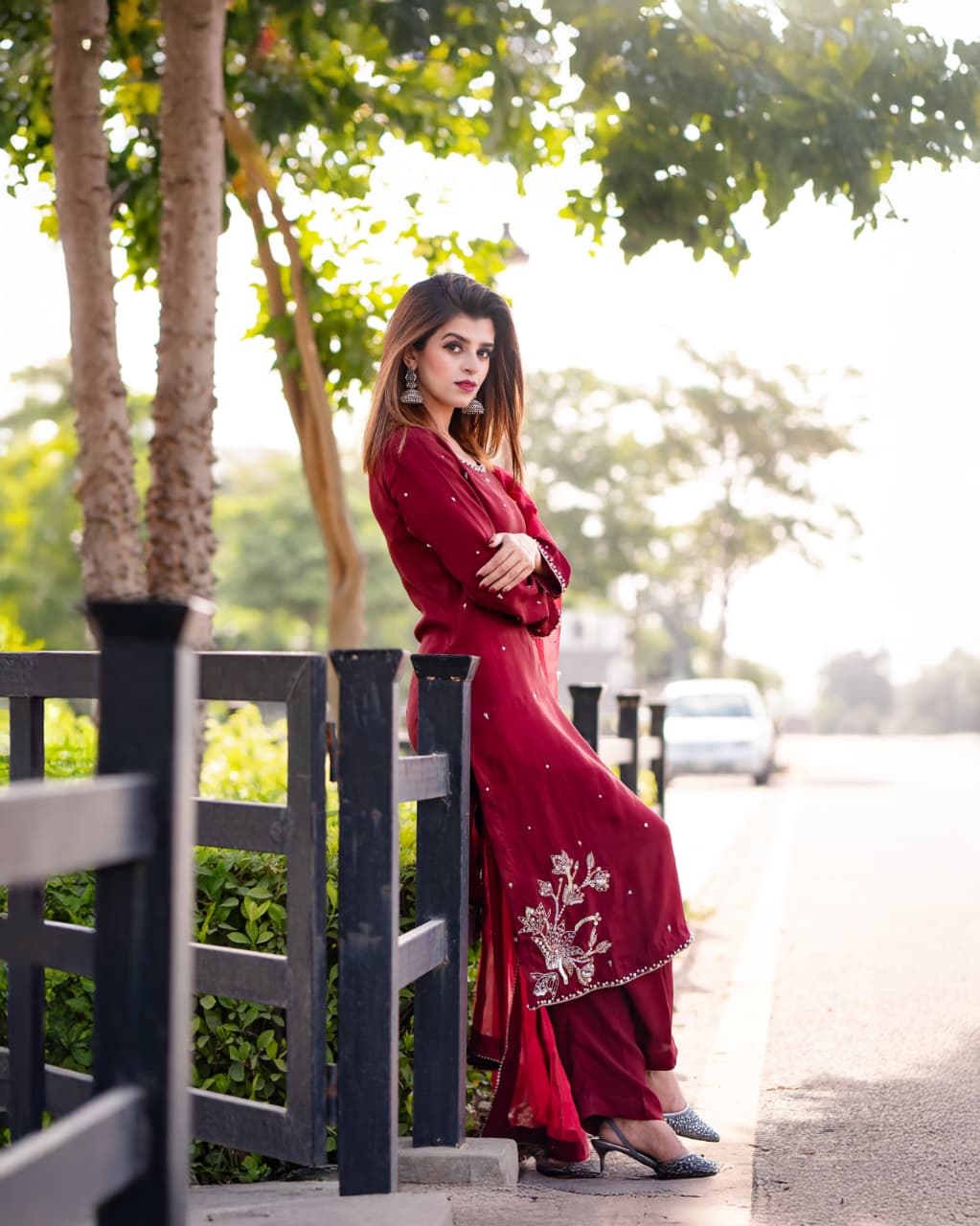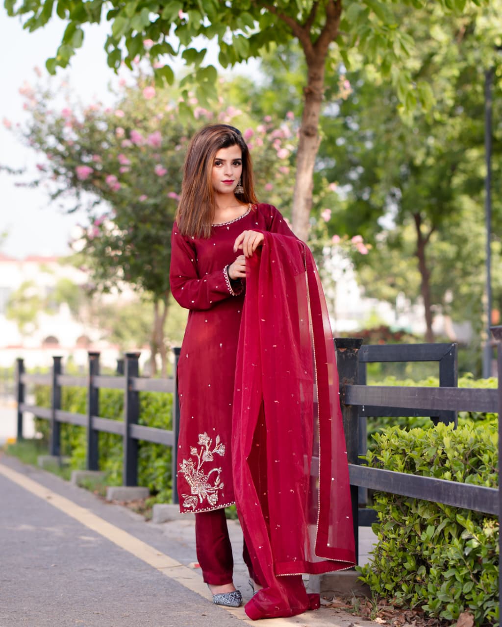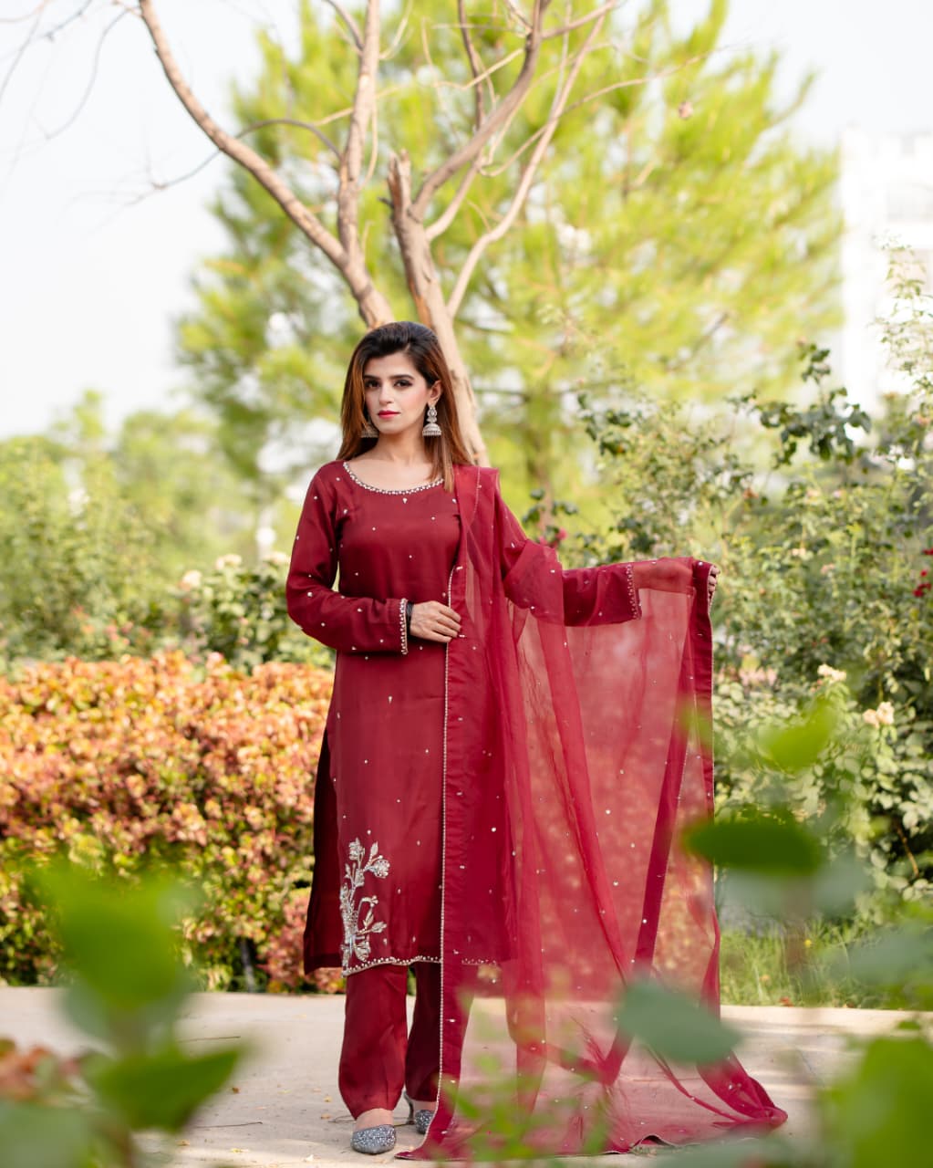 This stunning silk fabric features intricate embellishments with cutdana and crystals, complemented by sequence embroidery throughout the dress. The entire garment is adorned with a crystal spray, adding a touch of luxury. The accompanying dupatta is also embellished with a similar crystal spray, completing the elegant look.